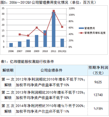 在給管理人員大幅加薪之后,是否能保持管理層的穩(wěn)定依然值得關(guān)注。首先,公司引進(jìn)人員在鋰電池領(lǐng)域從業(yè)經(jīng)驗并不長,如:2012年3月新加入的鋰離子電池事業(yè)部負(fù)責(zé)人原從事磁帶機(jī)芯、DVD機(jī)芯的研究工作;其次,公司“家族”式管理的氛圍依然比較濃厚,能否為新進(jìn)管理人員提供一個寬松的工作環(huán)境還需要觀察;再次,公司為管理層量身定做了509.40萬股的激勵方案,但是其中460.65萬股是期權(quán),行權(quán)價格14.98元/股,行權(quán)條件也比較苛刻,每年凈利潤增長率要高于30%(如表1所示)。公司股權(quán)激勵方案可能為往后公司管理層動蕩埋下隱患。