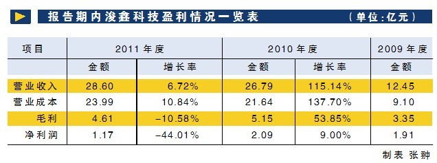 據(jù)浚鑫科技預(yù)披露招股書顯示,2009年、2010年和2011年?duì)I業(yè)收入分別為12.45億元、26.79億元和28.60億元,對(duì)應(yīng)年度的凈利潤分別為1.91億元、2.09億元和1.17億元。