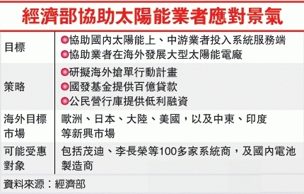 國(guó)發(fā)基金將鼓勵(lì)太陽(yáng)能廠至海外設(shè)太陽(yáng)能電廠,茂迪、昱晶、新日光、旺能、中美晶、綠能、旭晶等都將受惠,茂迪更樂(lè)觀預(yù)期,百億元資金將可有效提振市場(chǎng)信心,業(yè)者將極力爭(zhēng)取相關(guān)補(bǔ)助。