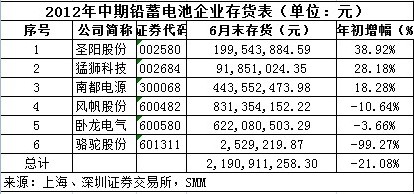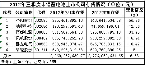 如下圖所示,2012年三季度末, 6家鉛蓄電池上市公司存貨金額高達(dá)29.6億,二季度末存貨金額為21.9億,年初為27.8億。二季度末存貨金額較年初下降21.08%,三季度末較年初則增加6.63%。