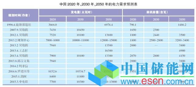 風(fēng)電、太陽(yáng)能比重大的丹麥、德國(guó)、意大利等國(guó),由于重復(fù)容量多,裝機(jī)容量為最高負(fù)荷的一倍以上。如果沒(méi)有重復(fù)容量,裝機(jī)容量只需要比最大負(fù)荷高20%~30%,滿足備用容量需要就可以了。從12個(gè)電力預(yù)測(cè)來(lái)看,發(fā)電量的預(yù)測(cè)數(shù)字變化不大,如2012年1月,吳敬儒預(yù)測(cè)2050年發(fā)電量為13.8萬(wàn)億千瓦時(shí),到2015年4月白建華預(yù)測(cè)2050年發(fā)電量也只有14.9~15萬(wàn)億千瓦時(shí)。如果考慮儲(chǔ)能損失的電量,如果儲(chǔ)能容量大,損失的電量多,風(fēng)電、太陽(yáng)能光伏發(fā)電預(yù)測(cè)電量也會(huì)增加一些。總之,發(fā)電量增加的幅度遠(yuǎn)小于裝機(jī)容量增加的幅度??梢?jiàn),電力預(yù)測(cè)中裝機(jī)容量和發(fā)電量偏小的一個(gè)重要原因是沒(méi)有考慮重復(fù)容量和儲(chǔ)能容量,沒(méi)有考慮儲(chǔ)能包括抽水蓄能損失的電量。
