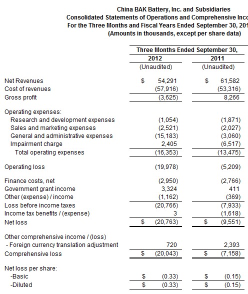 根據(jù)財報顯示,比克電池實現(xiàn)營收5510萬美元,環(huán)比增長17.8%,同比降低10.6%。公司毛虧損360萬美元,上一季度毛虧損510萬美元,去年同期毛利潤830萬美元。同比毛利潤轉(zhuǎn)虧的主要原因在于prismatic產(chǎn)品的銷量和毛利降低,此外庫存計提顯著增加。運營虧損2000萬美元,上一季度為運營虧損2450萬美元,去年同期運營虧損520萬美元。凈虧損2080萬美元,或每股虧損0.33美元,上一季度為凈虧損2760萬美元或每股虧損0.44美元,去年同期為凈虧損960萬美元,或每股虧損0.15美元。截至2012年9月30日,比克電池共有現(xiàn)金和現(xiàn)金等價物930萬美元。