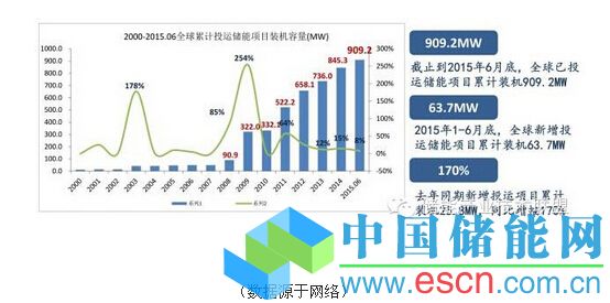 2015年上半年,全球儲能市場持續(xù)發(fā)酵,應用需求進一步增大。根據(jù)CNESA數(shù)據(jù)庫統(tǒng)計,截止到2015年6月底,全球新增儲能項目45個,裝機307.5MW,其中投運項目14個,裝機63.7MW;在建項目4個,裝機47.5MW;規(guī)劃的項目27個,裝機196.3MW。