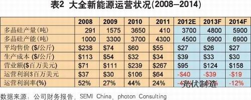 需求不振,從模組到多晶硅的價格也就失去了回穩(wěn)和反彈的基礎(chǔ)。以多晶硅價格為例,目前維持在27~28美元/公斤的長約價格和22~23美元/公斤的現(xiàn)貨市場價格在今年下半年要反彈到大約35美元/公斤以上的可能性微乎其微。因此,對于眾多生產(chǎn)成本在30-35美元/公斤的中國廠商來說,關(guān)閉工廠成了必然的選擇。當然,市場需求(包括價格)和生產(chǎn)成本并不是決定企業(yè)生死存亡的唯一因素。中國一些有大型國營和民營集團背景的多晶硅廠商有可能通過母公司或者銀行的財政支持,在虧本的情況下繼續(xù)維持一段時間,關(guān)鍵是虧本經(jīng)營的時間可以維持多久?表2顯示了大全新能源自2008年以來的運營狀況以及一些機構(gòu)的預測。這一預測顯示,大全新能源在未來2~3年里有可能一直處于虧損狀態(tài),除非市場出現(xiàn)戲劇性好轉(zhuǎn)。公司的市場和經(jīng)營戰(zhàn)略轉(zhuǎn)型看來不可避免。