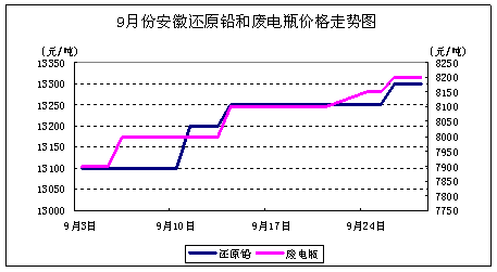 上海鉛現(xiàn)貨市場,9月份鉛現(xiàn)貨價格一路從15000元/噸起步,最高上漲至15800元/噸,累計上漲800元/噸,漲幅5.3%;對比滬期鉛6.83%以及倫鉛15.8%的月度漲幅,上海鉛現(xiàn)貨價格漲幅受到很大的限制。