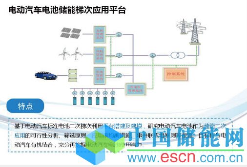 電動汽車電池儲能梯次應用平臺。其顯著特點是基于電動汽車標準電池二次梯次利用平臺搭建及建模,研究電動汽車電池作為儲能二次應用的可行性分析、篩選原則、應用前均衡措施、串并聯(lián)成組原則等課題,目標將與電動汽車有機結合,充分再挖掘電動汽車電池使用潛力。