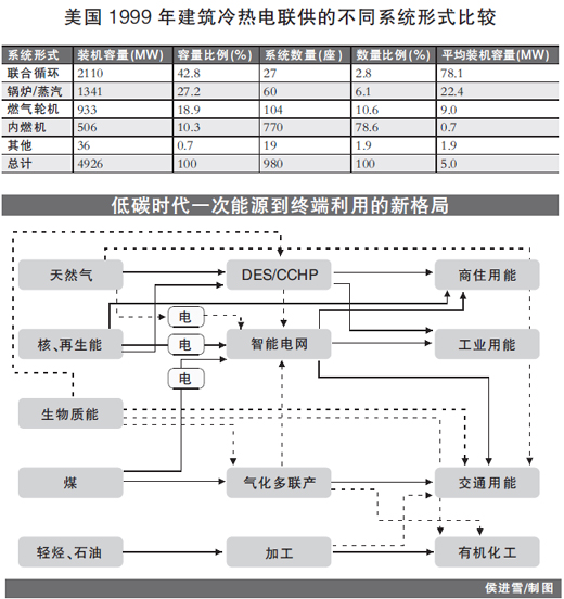 然而,與美國不同,中國城市絕大多數(shù)人居住在多層或高層單元住宅樓內,中國大部分城市的工業(yè)區(qū)、商業(yè)中心、居住區(qū)三種終端需求負荷的空間位置相對較近,居住的集合化程度高。這使中國DES項目的冷、熱水、蒸氣等負荷可以集成互補,所以中國的DES的規(guī)??梢愿?,聯(lián)產效率能夠更高。