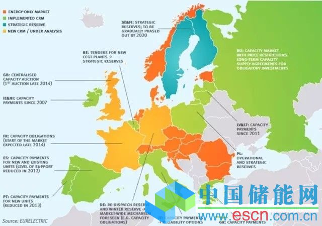 為此,人們?cè)O(shè)計(jì)了容量市場(chǎng)并形成了幾種不同的模式。以歐洲為例,就有法國(guó)的強(qiáng)制容量備用體制,西班牙的戰(zhàn)略補(bǔ)償體制,英國(guó)的集中容量拍賣等幾種不同的模式。在歐盟的ACER監(jiān)管中心網(wǎng)站上,我們可以找到如下的一張全歐的不同容量市場(chǎng)體制的分布圖。