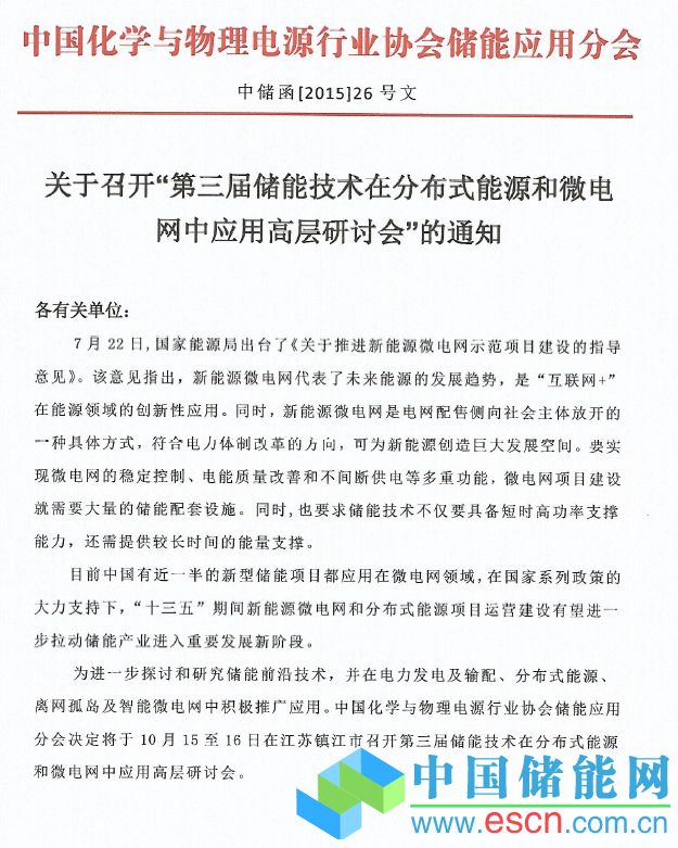 為進一步探討和研究前沿儲能技術(shù),并在電力發(fā)電及輸配、分布式能源、離網(wǎng)孤島應(yīng)用及智能微電網(wǎng)中積極推廣和利用儲能技術(shù)。中國化學(xué)與物理電源行業(yè)協(xié)會儲能應(yīng)用分會與中國儲能網(wǎng)將于10月15至16日在江蘇鎮(zhèn)江明都大飯店召開第三屆儲能技術(shù)在微電網(wǎng)及分布式能源中的應(yīng)用高層研討會。