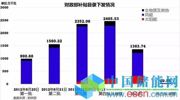 不多說直接上圖,這是最新的補(bǔ)助目錄發(fā)放情況,若不計(jì)2015年7月下發(fā)的第五批調(diào)整目錄,補(bǔ)助目錄已經(jīng)1年沒有更新。從裝機(jī)容量來看,已列入目錄的太陽能及風(fēng)能項(xiàng)目合計(jì)8118萬千瓦,然而截2015至6月末,太陽能及風(fēng)能項(xiàng)目合計(jì)14069萬千瓦,意味著約有5000多萬千瓦的項(xiàng)目因沒有列入目錄而拿不到補(bǔ)貼。(全國并網(wǎng)風(fēng)電裝機(jī)容量10491萬千瓦,全國光伏發(fā)電裝機(jī)容量3578萬千瓦,光伏電站3007萬千瓦,分布式光伏571萬千瓦。)