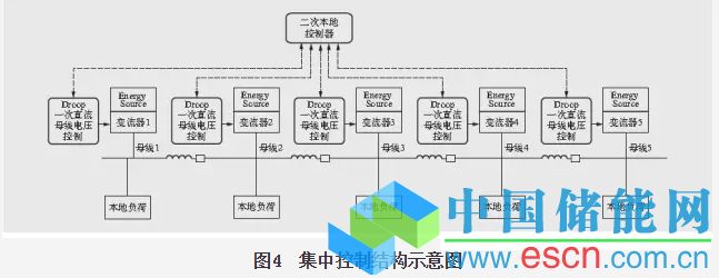 在直流微電網(wǎng)多源協(xié)調(diào)控制中包含一個微電網(wǎng)中央控制器(MGCC),檢測直流母線電壓以及參與直流母線電壓調(diào)節(jié)的各單元輸出功率,然后進(jìn)行相應(yīng)的電壓恢復(fù)和均流控制,通過集中的低帶寬通信網(wǎng)絡(luò)與參與下垂控制的各分布式電源或交直流接口變流器的直流母線電壓控制系統(tǒng)進(jìn)行通信,調(diào)整其下垂曲線設(shè)定點(diǎn)等控制參數(shù),來實(shí)現(xiàn)相應(yīng)控制目的,見圖4。這種控制手段的最大缺陷就是如果直流微電網(wǎng)二次集中控制器出現(xiàn)故障,直流微電網(wǎng)將無法實(shí)現(xiàn)協(xié)調(diào)控制功能。