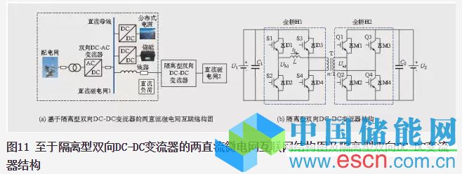 對于圖1所示復(fù)雜直流微電網(wǎng)(或多直流微電網(wǎng)、直流微電網(wǎng)群),如何進(jìn)行互聯(lián)及相互支撐控制將是決定其是否能高效可靠運(yùn)行的關(guān)鍵因素之一。按傳統(tǒng)思路,通??梢圆捎寐?lián)絡(luò)開關(guān)(如直流斷路器等)用于直流微電網(wǎng)之間的互聯(lián),優(yōu)勢是成本低、聯(lián)絡(luò)線開關(guān)損耗小。為實(shí)現(xiàn)多直流微電網(wǎng)之間可靠互聯(lián)、電氣隔離及靈活支撐等功能,可采用隔離型雙向全橋DC-DC變流器(DAB)代替普通聯(lián)絡(luò)開關(guān),作為多直流微電網(wǎng)之間的互聯(lián)裝置,見圖11(a)。一類典型隔離型雙向DC-DC變流器拓?fù)浣Y(jié)構(gòu)見圖11(b),該隔離型雙向DC-DC變流器的優(yōu)點(diǎn)是:①高頻變壓器一方面通過電氣隔離使系統(tǒng)獲得更高的可靠性,另一方面取代了傳統(tǒng)的工頻變壓器,降低了系統(tǒng)的尺寸和重量,提高了功率密度;②高頻隔離變壓器一/二次變比根據(jù)互聯(lián)直流微電網(wǎng)電壓等級可靈活選擇;③能量能夠雙向流動,控制方式靈活。DAB的引入將徹底改變直流微電網(wǎng)群的供電方式,避免普通聯(lián)絡(luò)開關(guān)所帶來的安全隱患,可極大提高直流微電網(wǎng)群相互支撐控制的實(shí)時性與快速性。