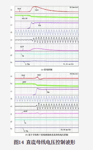 直流微電網(wǎng)為直流負(fù)荷供電,模擬光伏出力保持在2.5kW左右,暫態(tài)情況為模擬電池儲能系統(tǒng)通過DC-DC電路從待機(jī)模式切換為35A放電控制,由雙向DC-AC變流器控制直流母線電壓,分別采用常規(guī)控制和基于非線性干擾觀測器的直流母線電壓控制,實(shí)驗(yàn)波形見圖14(a)、圖14(b)。