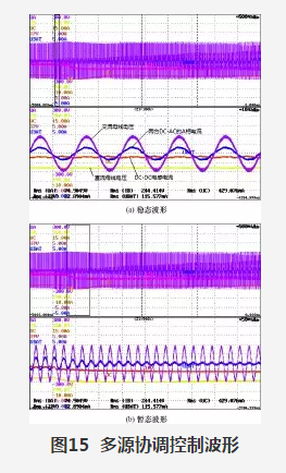 (b)所示為DC-DC輸出800W突變至200W時的暫態(tài)波形,從圖中可以看出2臺DC-AC變流器在暫態(tài)過程中的均流效果和直流母線電壓控制效果良好。圖15所示實(shí)驗(yàn)結(jié)果表明下垂控制策略在直流微電網(wǎng)多源協(xié)調(diào)控制中具有良好的應(yīng)用前景。