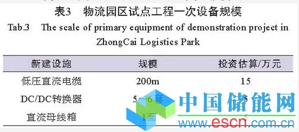 該工程共計新建低壓直流電纜約200m,DC/DC轉(zhuǎn)換裝置6套,直流母線箱一面(直流斷路器型),總投資約25萬元。物流園區(qū)試點工程一次設(shè)備規(guī)模見表3。