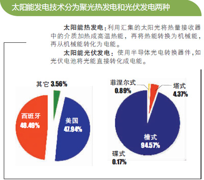 在國外,太陽能熱發(fā)電已有幾十年的發(fā)展歷史。上個世紀(jì)80年代末和90年代初,美國在加利福尼亞州的莫哈韋沙漠建有裝機容量為354MW的槽式太陽能熱發(fā)電站,為世界首座。雖然目前西班牙和美國占總太陽能熱發(fā)電市場的90%,但是歐洲在北非的太陽能計劃中,主要發(fā)電模式將是太陽能聚熱發(fā)電而非光伏發(fā)電。