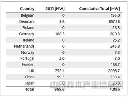 資料2.全球海上風(fēng)力發(fā)電裝機(jī)容量(2011年,累計(jì))(出處) GWEC – Global Wind 2011 Report