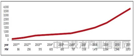 其中海上發(fā)電設(shè)備一年設(shè)置了97萬千瓦,到2011年年底累計(jì)設(shè)置410萬千瓦。在410萬千瓦中,有381萬千瓦設(shè)置于歐盟。剩余的基本是中國進(jìn)行的實(shí)證業(yè)務(wù),歐盟創(chuàng)造了海上風(fēng)力發(fā)電的歷史。資料1表示了歐盟海上風(fēng)力發(fā)電裝機(jī)容量的變化,可以看出正順利增長。