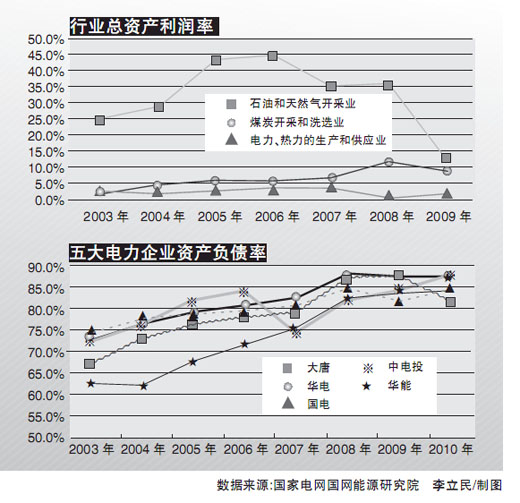 數(shù)據(jù)顯示,自2002年以來,我國電力行業(yè)盈利水平逐步下滑,2009年總資產(chǎn)利潤率1.9%,遠(yuǎn)低于煤炭行業(yè)9.3%、石油行業(yè)12.8%的水平。2008年以來,五大發(fā)電集團(tuán)火電廠累計虧損600多億元,而煤炭企業(yè)神華集團(tuán)2010實現(xiàn)凈利潤468億元,凈資產(chǎn)收益率14.8%,是五大發(fā)電集團(tuán)最好水平(華能)的3倍。2002年以來電力行業(yè)總資產(chǎn)利潤率與石油、煤炭行業(yè)之間的差距日益拉大,煤電價格機(jī)制不順,導(dǎo)致電力行業(yè)利潤向煤炭行業(yè)轉(zhuǎn)移。