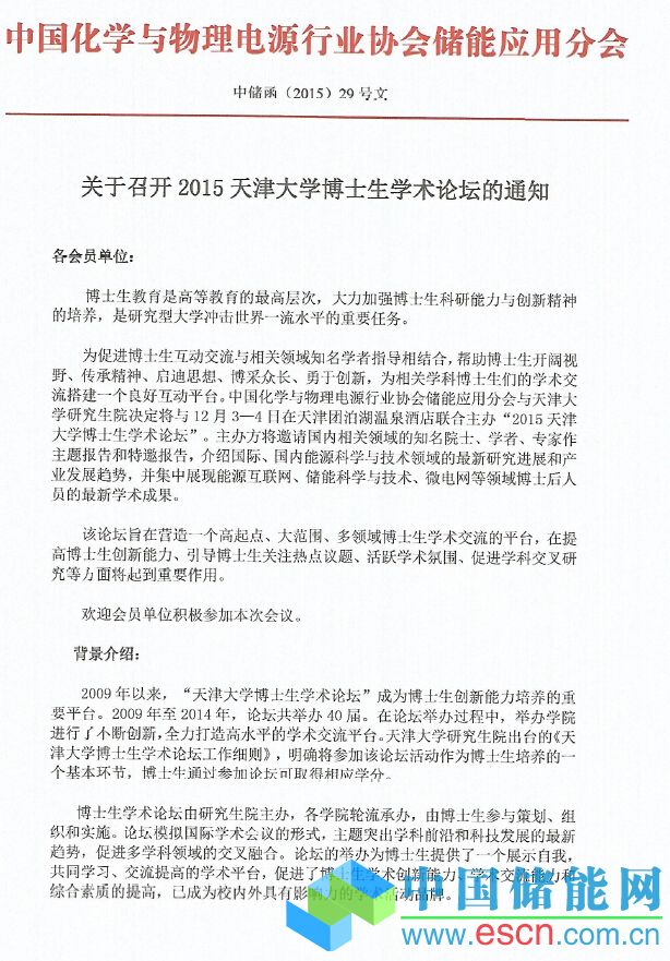 為促進(jìn)博士生互動(dòng)交流與相關(guān)領(lǐng)域知名學(xué)者指導(dǎo)相結(jié)合,幫助博士生開闊視野、傳承精神、啟迪思想、博采眾長(zhǎng)、勇于創(chuàng)新,為相關(guān)學(xué)科博士生們的學(xué)術(shù)交流搭建一個(gè)良好互動(dòng)平臺(tái)。中國(guó)化學(xué)與物理電源行業(yè)協(xié)會(huì)儲(chǔ)能應(yīng)用分會(huì)與天津大學(xué)研究生院決定將于12月3—4日在天津團(tuán)泊湖溫泉酒店聯(lián)合主辦“2015天津大學(xué)博士生學(xué)術(shù)論壇”。主辦方將邀請(qǐng)國(guó)內(nèi)相關(guān)領(lǐng)域的知名院士、學(xué)者、專家作主題報(bào)告和特邀報(bào)告,介紹國(guó)際、國(guó)內(nèi)能源科學(xué)與技術(shù)領(lǐng)域的最新研究進(jìn)展和產(chǎn)業(yè)發(fā)展趨勢(shì),并集中展現(xiàn)能源互聯(lián)網(wǎng)、儲(chǔ)能科學(xué)與技術(shù)、微電網(wǎng)等領(lǐng)域博士后人員的最新學(xué)術(shù)成果。