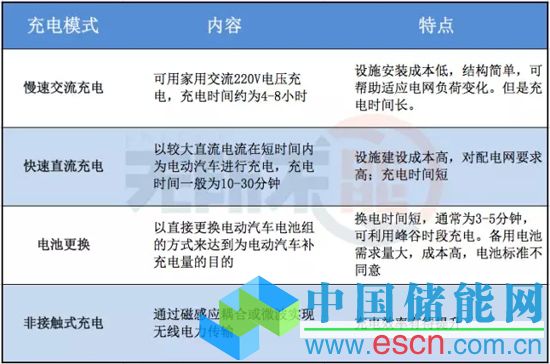 目前電動汽車的充電方式主要包括慢速交流充電、快速直流充電、電池更換和非接觸式充電(無線充電)四類,特點如下圖: