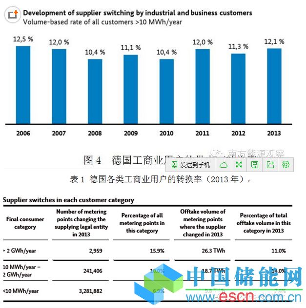 德國1998 年開始對所有用戶開放售電市場。到2013年,用戶的可選擇的已經(jīng)非常豐富了,終端用戶在每個網(wǎng)絡(luò)區(qū)域平均可以選擇97個供應(yīng)商(不考慮關(guān)聯(lián)公司),家庭用戶可選的供應(yīng)商數(shù)量平均為80個。用戶信息的獲取、合同的轉(zhuǎn)換也非常便利,一個電話或在線按個ENTER就可以解決。在零售商競爭如此激烈,用戶選擇如此眾多、便利的市場上,2013年德國居民用戶轉(zhuǎn)換率僅為7.8%,居民用戶電量轉(zhuǎn)換率為8.6%。2006-2013年間,德國商業(yè)和工業(yè)用戶轉(zhuǎn)換率平均每年僅12%左右,包括同一零售商下的不同合同轉(zhuǎn)換和不同零售商之間的來回轉(zhuǎn)換(見圖4),其中年電量大于2GWh的用戶轉(zhuǎn)換率居中,為11%,年電量在10MWh至2GWh的用戶轉(zhuǎn)換率最高,為14.0%,而年電量較小的客戶轉(zhuǎn)換率最低,為7.8%。電量大的用戶對價格更加敏感,在售電市場中更加活躍,而電量非常大的用戶,作為零售商的主要創(chuàng)收來源,零售商們可能提供了更優(yōu)惠的價格或更專一的服務(wù),以增強客戶粘性。在一來一往的相互選擇下,造就了售電市場的競爭格局。英國也是最早放開售電市場的國家之一,但2014年電力用戶的轉(zhuǎn)換率也僅為11.1%。