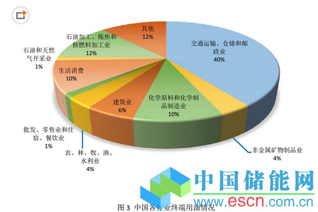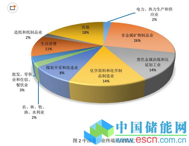 國家統(tǒng)計局?jǐn)?shù)據(jù)顯示,2014年中國能源消費量約42億噸標(biāo)準(zhǔn)煤,按終端消費量看,電能占比僅23%(圖1)。除電力以外,煤和石油兩種化石能源各占剩余總量的約32%。其中,非金屬礦物制品業(yè)、黑色金屬冶煉和壓延加工業(yè)、生活消費三大領(lǐng)域,分別消耗了終端用煤的26%,14%,11%(圖2)。石油則主要消耗在交通運輸、倉儲和郵政業(yè),占到了終端用油的40%(圖3)。
