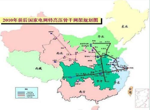 2010年,國(guó)家特高壓電網(wǎng)將在華北、華中和華東地區(qū)形成晉東南~南陽(yáng)~荊門(mén)~武 漢~蕪湖~杭北~上?!珶o(wú)錫~南~徐 州~安陽(yáng)~晉東南雙環(huán)網(wǎng)作為特高壓主網(wǎng) 架;西北、華北火電通過(guò)蒙西~北~石家 莊~安陽(yáng)以及蒙西~陜北~晉東南2個(gè)獨(dú)立 送電通道注入特高壓主網(wǎng),西南水電通過(guò) 樂(lè)山~重慶~恩施~荊門(mén)雙回路通道注入 特高壓主網(wǎng)。 ?