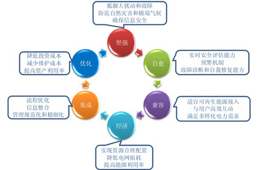 智能電網(wǎng)主要有堅(jiān)強(qiáng)、自愈、兼容、經(jīng)濟(jì)、集成、優(yōu)化等特征。堅(jiān)強(qiáng)的特征表現(xiàn)在能夠抵御大擾動(dòng)和故障、防范自然災(zāi)害和極端氣候、確保信息安全;自愈的特征表現(xiàn)在實(shí)時(shí)的安全評(píng)估能力、預(yù)警機(jī)制、故障診斷和自我修復(fù)能力;兼容的特征表現(xiàn)在適宜可再生能源和分布式電源接入、與用戶高效互動(dòng)、滿足多樣化電力需求;經(jīng)濟(jì)的特征表現(xiàn)在實(shí)現(xiàn)資源合理配置、降低電網(wǎng)損耗、提高能源利用率;集成的特征表現(xiàn)在實(shí)現(xiàn)電網(wǎng)信息的高度融合和共享;優(yōu)化的特征表現(xiàn)在降低投資成本和維護(hù)成本。
