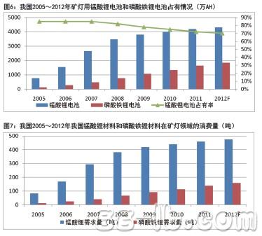 考慮損耗等因素,1AH鋰離子電池需要11克的錳酸鋰正極材料或者8.5克的磷酸鐵鋰正極材料;因此可以推算出,2012年礦燈領(lǐng)域需要消費(fèi)錳酸鋰材料475噸,磷酸鐵鋰材料160噸,這相比2005年只有82噸錳酸鋰材料和11噸磷酸鐵鋰材料的消費(fèi)量有了明顯提升(圖7),礦燈領(lǐng)域材料消費(fèi)量均占這兩種正極材料總體消費(fèi)量的5%左右。