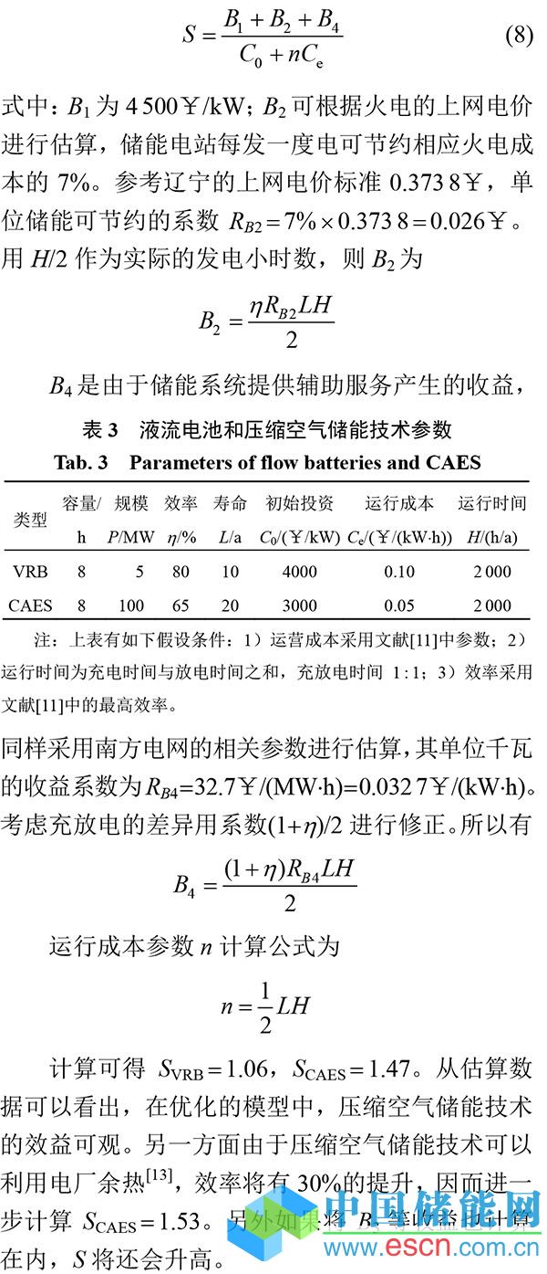 以壓縮空氣儲(chǔ)能和液流釩電池儲(chǔ)能技術(shù)為例,根據(jù)上述模型進(jìn)行半定量的估算分析。為進(jìn)一步簡(jiǎn)化模型對(duì)于輔助服務(wù)部分的影響,只計(jì)算目前可以量化的B4,同時(shí)設(shè)Igov為零??紤]儲(chǔ)能系統(tǒng)規(guī)模差異問(wèn)題,計(jì)算中單位均簡(jiǎn)化為千瓦級(jí)的儲(chǔ)能裝置,相關(guān)參數(shù)如表3所示[12],計(jì)算公式為