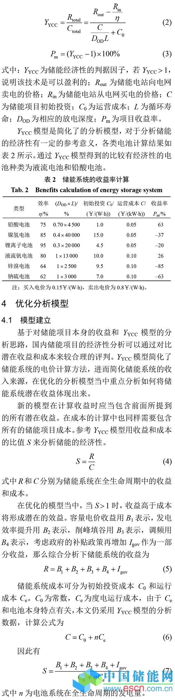 楊裕生院士在《規(guī)模儲(chǔ)能裝置經(jīng)濟(jì)效益的判據(jù)》一文中簡(jiǎn)化了經(jīng)濟(jì)性分析的邊界條件,首次建立了簡(jiǎn)單的模型用于分析儲(chǔ)能系統(tǒng)的經(jīng)濟(jì)性[10]。模型中考慮了儲(chǔ)能電價(jià)、電池效率、初始投資、運(yùn)行成本、放電深度和循環(huán)壽命等因素,計(jì)算公式為