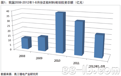 投資漸趨理性2008年以來(lái)我國(guó)正極材料規(guī)劃投資總額達(dá)121億元,其中2008~2012年1~8月份分別為11.5億元、14.5億元、40億元、33億元和22億元(圖1)。