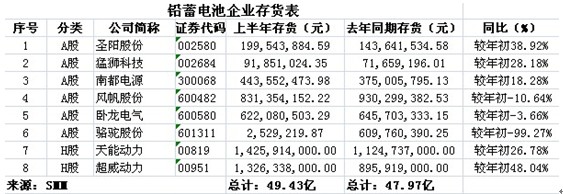 中國(guó)儲(chǔ)能網(wǎng)訊:上海有色網(wǎng)(SMM)對(duì)上市公司中報(bào)整理發(fā)現(xiàn),上半年8家鉛蓄電池企業(yè)存貨高達(dá)49.43億,而其上半年凈利總和僅為10.67億元,存貨相當(dāng)于凈利的4.65倍。由此可見(jiàn),下半年鉛蓄電池企業(yè)去庫(kù)存壓力仍然很大。