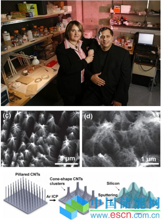 現(xiàn)在,加州大學(xué)河濱分校的研究人員已經(jīng)開(kāi)發(fā)出一種新的架構(gòu)來(lái)將硅應(yīng)用在鋰電池的陽(yáng)極上。不僅能夠使單位重量材料攜帶更多電量,同時(shí)能讓充電速度快16倍左右。研究人員首先構(gòu)建了一層石墨烯薄片,并在此基礎(chǔ)上使用柱狀碳納米管構(gòu)建了柱狀的納米結(jié)構(gòu)。最后他們使用溫和的電感耦合等離子體使之柱狀納米管變成錐形結(jié)構(gòu),最后他們將非晶硅沉積在上面。