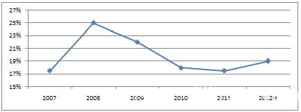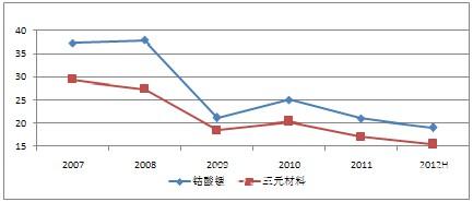 根據(jù)高工鋰電產(chǎn)業(yè)研究所(GBII)調(diào)研結(jié)果顯示,2012年上半年三元材料的毛利率為19%,比2011年微升1.5個(gè)百分點(diǎn),毛利率上升的原因主要是鎳價(jià)同比下降20%,前驅(qū)體的價(jià)格降幅也在20%左右,三元材料成品價(jià)格的降幅15%左右(圖7)。我國三元材料行業(yè)的盈利能力取決于鎳價(jià)走勢,一旦鎳價(jià)往上走,很有可能面臨全行業(yè)虧損的局面。