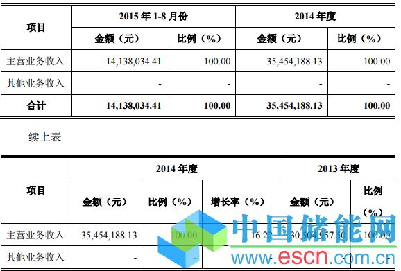 聚能炭成立于2005年9月19日,其公開轉(zhuǎn)讓說明書顯示,公司系鋰離子電池負(fù)極材料研發(fā)生產(chǎn)型企業(yè),主要產(chǎn)品為:改性人造石墨類鋰電池負(fù)極材料和天然石墨類鋰電池負(fù)極材料。公司2015年1-8月、2014年和2013年營業(yè)收入分別為14,138,034.41元、35,454,188.13元和30,504,957.50元。2015年1-8月、2014年和2013年公司的主營業(yè)務(wù)收分別為14,138,034.41元、35,454,188.13元和30,504,957.50元,主營業(yè)務(wù)收入占營業(yè)收入比例分別均為100%。公司自成立以來一直致力于鋰電池負(fù)極材料的研發(fā)、生產(chǎn)及銷售,未發(fā)生其他業(yè)務(wù)收入,公司業(yè)務(wù)明確。