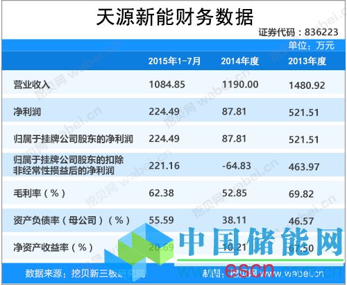 天源新能成立于2004年3月30日。公告顯示,天源新能2013年度、2014年度、2015年1-7月營業(yè)收入分別為1480.92萬元、1190萬元、1084.85萬元;凈利潤分別為521.51萬元、87.81萬元、224.49萬元。如下圖所示: