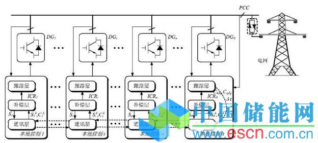 本發(fā)明涉及微電網和電能質量管理,旨在提供一種用于微電網中多功能并網逆變器并聯的群體智能控制方法。該方法針對微電網并網點PCC處的指定次數諧波、無功電流,采用一種多功能逆變器群體智能控制策略,采用基于有限時間一致性算法的全分布式分層控制方案進行補償,并實現各分布式電源按照自身剩余容量比例分攤補償容量的控制方法。
