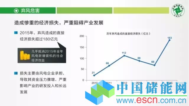 自2010年開始,棄風(fēng)問題愈演愈烈,全國平均棄風(fēng)率長期高于10%。2015年,這一數(shù)據(jù)攀升至15%。特別是入冬后,甘肅、寧夏、黑龍江等省區(qū)的一些風(fēng)電項目的棄風(fēng)率更是高達(dá)60%以上。棄風(fēng)限電帶來的最直接后果就是巨額的經(jīng)濟(jì)損失。經(jīng)測算,2010年至2015年,棄風(fēng)電量累計達(dá)到997億千瓦時,直接經(jīng)濟(jì)損失超過530億元。僅2015年的棄風(fēng)電量就達(dá)到339億千瓦時,直接經(jīng)濟(jì)損失超過180億元。