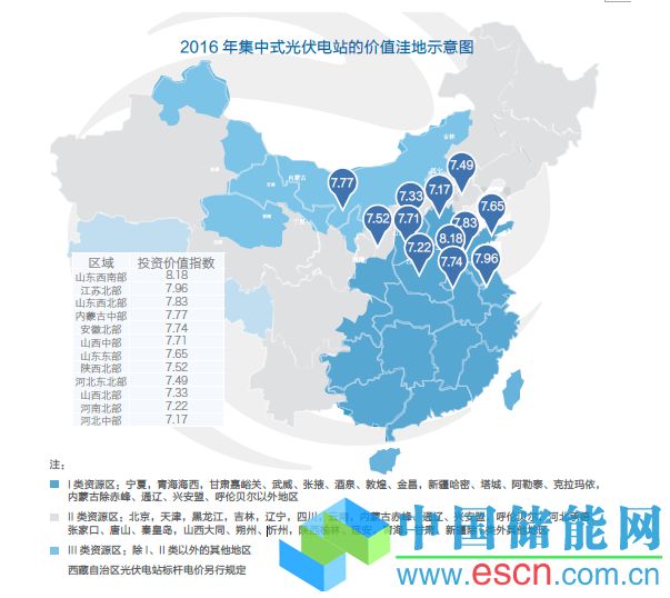 我國(guó)太陽(yáng)能資源區(qū)分為三類,自2016年1月1日起,我國(guó)光伏標(biāo)桿上網(wǎng)電價(jià)執(zhí)行新標(biāo)準(zhǔn),I、II類資源區(qū)分別降低10分錢、7分錢,III類資源區(qū)降低2分錢。根據(jù)上網(wǎng)電價(jià)這一變量要素,利用投資價(jià)值指數(shù)公式計(jì)算可得出,上網(wǎng)電價(jià)的下調(diào),使三類資源區(qū)的投資價(jià)值顯現(xiàn)。