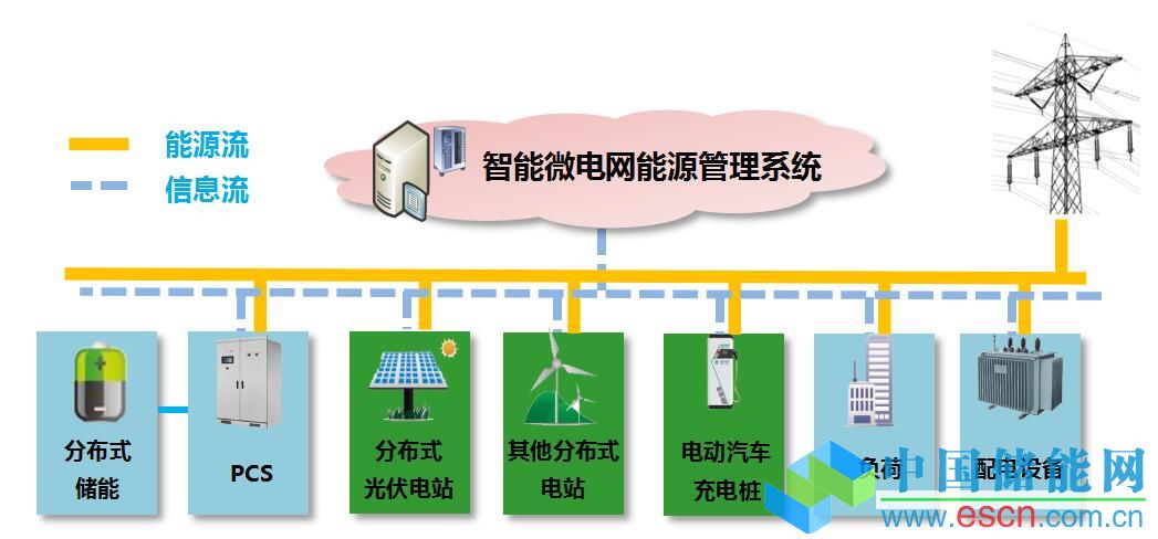 通常來說,微電網(wǎng)的一般結(jié)構(gòu)如下圖所示,由能源流和信息流相互融合而成,分為分布式能源、儲(chǔ)能裝置、電能變換裝置、保護(hù)裝置和微電網(wǎng)能源管理系統(tǒng)組成,也可根據(jù)實(shí)際應(yīng)用情況進(jìn)行增減。相對于大電網(wǎng),微電網(wǎng)表現(xiàn)為單一的受控單元,它可以保證用戶電能的質(zhì)量和供電安全,同時(shí)也是智能電網(wǎng)及能源互聯(lián)網(wǎng)的重要組成部分。