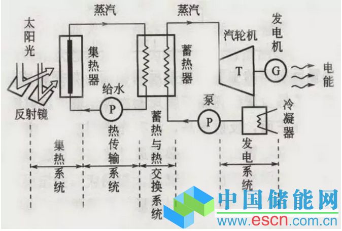 光熱發(fā)電技術(shù),是不同于光伏發(fā)電的全新的新能源應(yīng)用技術(shù)。它是一個將太陽能轉(zhuǎn)化為熱能,再將熱能轉(zhuǎn)化為電能的過程。利用聚光鏡等聚熱器采集的太陽熱能,將傳熱介質(zhì)加熱到幾百度的高溫,傳熱介質(zhì)經(jīng)過換熱器后產(chǎn)生高溫蒸汽,從而帶動汽輪機(jī)產(chǎn)生電能。此處的傳熱介質(zhì)多為導(dǎo)熱油與熔鹽。通常我們將整個的光熱發(fā)電系統(tǒng)分成四部分:集熱系統(tǒng)、熱傳輸系統(tǒng)、蓄熱與熱交換系統(tǒng)、發(fā)電系統(tǒng)。
