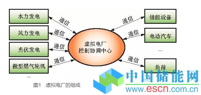虛擬電廠的提出是為了整合各種分布式能源,包括分布式電源、可控負荷和儲能裝置等。其基本概念是通過分布式電力管理系統(tǒng)將電網(wǎng)中分布式電源、可控負荷和儲能裝置聚合成一個虛擬的可控集合體,參與電網(wǎng)的運行和調(diào)度,協(xié)調(diào)智能電網(wǎng)與分布式電源間的矛盾,充分挖掘分布式能源為電網(wǎng)和用戶所帶來的價值和效益。虛擬電廠主要由發(fā)電系統(tǒng)、儲能設(shè)備、通信系統(tǒng)構(gòu)成,見圖1。