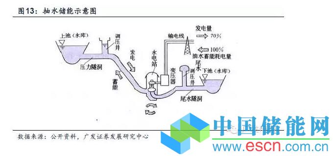 抽水蓄能是將電網(wǎng)低谷時利用過剩電力作為液態(tài)能量媒體的水從地勢低的水庫抽到地勢高的水庫,電網(wǎng)峰荷時高地勢水庫中的水回流到下水庫推動水輪機發(fā)電機發(fā)電,效率一般為75%左右,具有日調(diào)節(jié)能力,用于調(diào)峰和備用。