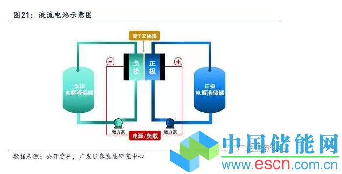 利用正負(fù)極電解液分開,各自循環(huán)的一種高性能蓄電池。電池的功率和能量是不相關(guān)的,儲存的能量取決于儲存罐的大小,因而可以儲存長達(dá)數(shù)小時至數(shù)天的能量,容量可達(dá)MW級。