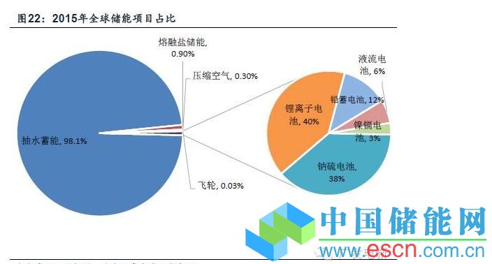 根據(jù)CNESA的統(tǒng)計,截止到2015年12月底,美國、日本和中國的電化學(xué)儲能累計裝機量位列全球前三名,占比分別為44%、35%和12%。智利是唯一進(jìn)入全球儲能裝機規(guī)模前十名的南美洲國家,德國則是歐洲儲能裝機比重最大的國家。國際市場中,鋰離子電池和鈉硫電池的裝機比例接近,分別為39%和38%;鋰離子電池的增速較快。而在中國市場,鋰離子電池裝機份額最大,為66%。其次是鉛蓄電池和液流電池,比例分別為15%和13%。