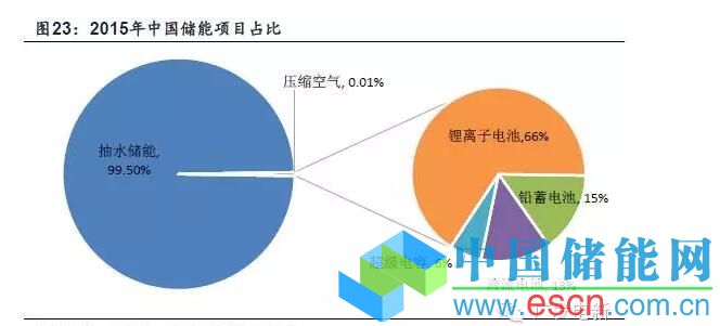 據(jù)CNESA項目庫不完全統(tǒng)計,預(yù)計到2015年底,中國儲能市場的累計裝機量(2000-2015年)為21.9GW,其中抽水蓄能為21.8GW;電化學(xué)儲能項目裝機106MW,占全球電化學(xué)儲能項目裝機總?cè)萘康?2%,與2012年的4%相比,有大幅提升。近五年,中國電化學(xué)儲能市場的增速明顯高于全球市場,年復(fù)合增長率(2010-2015年)為110%,是全球的6倍。在中國市場,鋰離子電池裝機份額最大,為66%。其次是鉛蓄電池和液流電池,比例分別為15%和13%。