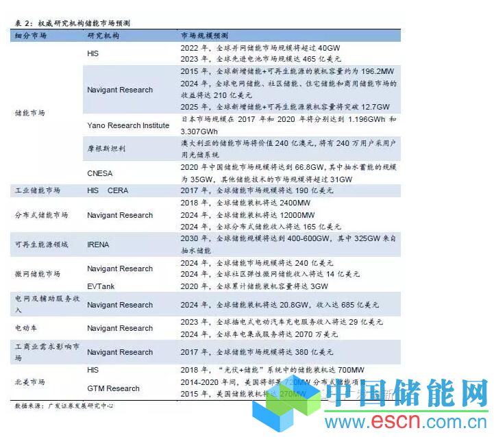 HIS、Navigant Research、Yano ResearchInstitute、摩根斯坦利、CNESA、GTM Research等研究機構(gòu)都對儲能市場做了相關(guān)預(yù)測,不同的機構(gòu)預(yù)測結(jié)果雖不相同,但對未來儲能市場的規(guī)模和發(fā)展都是樂觀的。