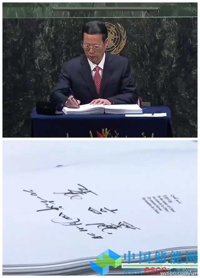 圖為中國(guó)國(guó)務(wù)院副總理張高麗作為習(xí)近平主席特使在《巴黎協(xié)定》上簽字。(來(lái)自@聯(lián)合國(guó) 官方微博)